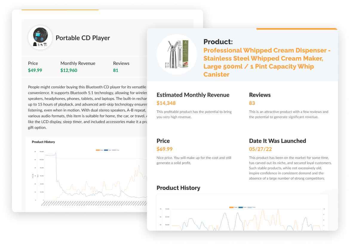 Product TrackerTrack each product’s daily sales and rating changes. Keep an eye on competing products and confirm viability before committing to selling.